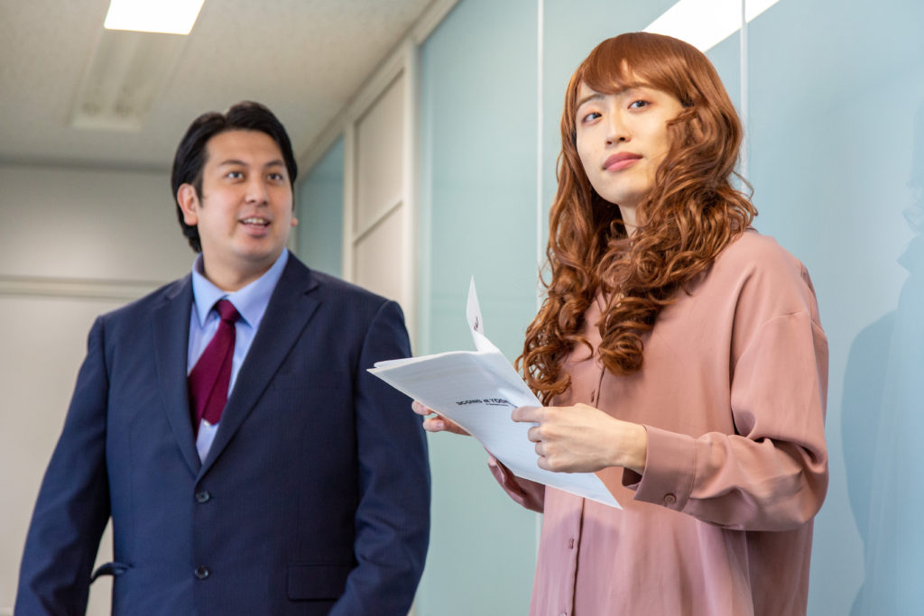 毎度のことながら、出オチ感漂うタヌキ社長。その間をもたせているのは、河崎作品初出演となる、お笑い芸人のレインボー。ちなみに池田直人はコントと同じ女性キャラクターとして登場している。